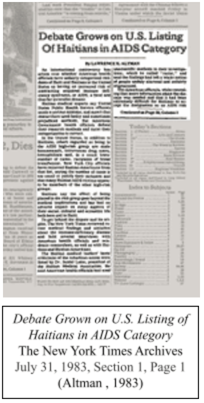 Altman , L. (1983). The New York Times Archives Newspaper July 31, 1983, Section 1, Page 1 . DEBATE GROWS ON U.S. LISTING OF HAITIANS IN AIDS CATEGORY. https://www.nytimes.com/1983/07/31/us/debate-grows-on-us-listing-of-haitians-in-aids-category.html.