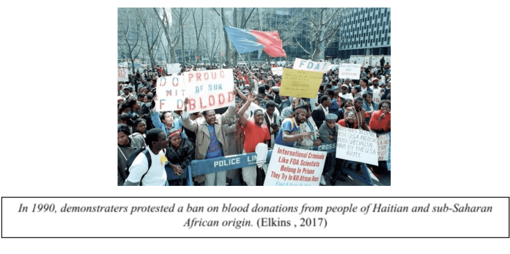 Elkins, R. (2017). Protests Against FDA Ban on Blood Donations from Haitians and people of Sub-Saharan African origin, 1990. Trump Reopens an Old Wound for Haitians. https://www.newyorker.com/news/news-desk/trump-reopens-an-old-wound-for-haitians.