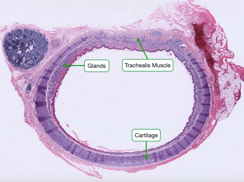 Figure 3. A cross section of the trachea with detail on the surface lining. Labels point to the glands on trachea surface, explored further below. Image from Yale Histology